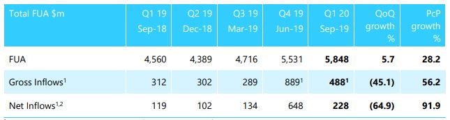 Key Highlights of September Quarter 2019: During the quarter, number of items processed soared up 44% year over year. The increase was primarily due to new client transitions and robust organic growth. The total number of Funds administered during the quarter increased by 45% and came in at 1,387 funds. Funds under administration (FUA) for the quarter came in at $5.848 billion, an increase of 28% year over year. Platform services amounted to 36% of total revenues in FY19. Platform services gross inflows came in at $488 million and net inflows stood at $228 million.