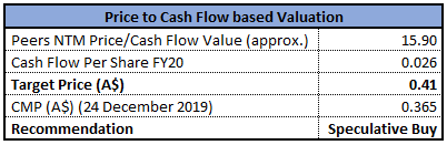 Stock Recommendation: As on 24 December 2019, the company’s market capitalisation stands at ~$97.68 million, with 267.62 million outstanding shares. In 2019, the company expects to roll-out a new payment platform and anticipates a reduction in execution risk and overall cost. The company expects that 2020 will provide improved scale benefits and margin expansion through the material transaction. Considering the above factors, we have valued the stock using two relative valuation methods, i.e., Price to Cash flow and EV/EBITDA multiples and arrived at a target price with upside in % terms. Hence,we recommend a “Speculative Buy” rating on the stock at the closing price of $0.365 per share as on 24 December 2019.