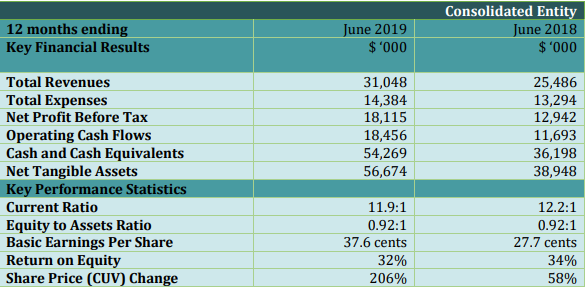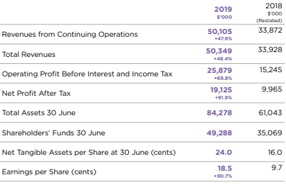 FY19 Key Highlights for the period ended June 30, 2019: Total revenue and other income for the period was reported at $32.50 million, an increase of 24% on a y-o-y basis. Profit after tax for the period was reported at $18.134 million, up from $13.224 million in prior corresponding year. During the period, the company reported an increase of 35.7% in earnings per share, which came in at 37.6 cents. Cash and cash equivalents at the end of the period was reported at $54.269 million. During the period, the Board of Directors declared an unfranked dividend of 25 cents per share. .png)