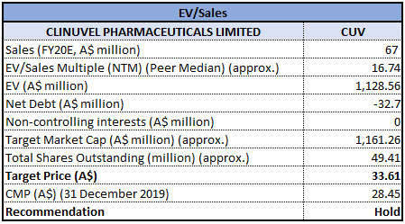 Stock Recommendation:The company has a market capitalisation of ~$1.43 billion and ~49.41 million outstanding shares. Currently, the stock is trading below the average of 52-week high and low of $45.880 and $17.770, respectively, proffering an opportunity for share accumulation. Its EBITDA margin and net margin for FY19 stood at 54.9% and 57.4%, better than the FY18 result of 48.5% and 51.4%, respectively, implying decent fundamentals for the company. Its current ratio for FY19 stood at 12.33x, higher than the industry median of 5.08x, which implies that the company is in a better position to address its short-term obligations. Debt to Equity ratio for FY19 stood at 0.01x, lower than the industry median of 0.19x. Considering the recent developments with respect to the key product SCENESSE®, strong cash position and decent outlook, we have valued the stock using a relative valuation method, i.e., EV/Sales multiple approach and arrived at a target price of lower double-digit upside (in percentage term). Hence, we recommend a “Hold” rating on the stock at the current market price of $28.450, down 1.557% on 31 December 2019.