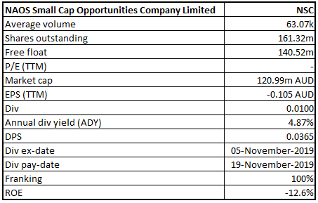 Managing Capital through Buy-Back Program: NAOS Small Cap Opportunities Company Limited (ASX: NSC) is a specialist fund manager who manages three Listed Investment Companies (LIC’s): the NAOS Emerging Opportunities Company Limited (NCC); the NAOS Ex- 50 Opportunities Company Limited (NAC); and the NAOS Small Cap Opportunities Company Limited (NSC). Each of the LICs target a concentrated portfolio of 10-20 companies. In order to effectively use the company’s capital and deliver additional shareholder value, NAOS announced an on-market share Buy-Back Program (Buy-Back Program) during March 2019. Till now, the company has bought back 7,705,947 shares under the Buy-Back Program for a total consideration of around $5 million. As at 30 November 2019, NAOS had Pre-Tax NTA of $0.86.