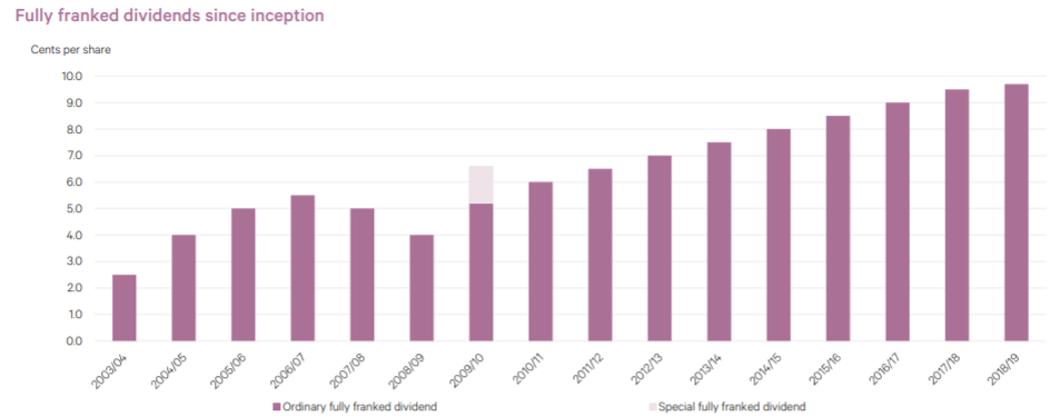 Regular Stream of fully franked dividends: For the financial year ended 30 June 2019, the company paid a dividend of 4.00 cents per share (100% franked). For the three-month period ending 30 September 2019 or Q1 FY20, the company paid a fully franked dividend 1.00 cents per share, demonstrating regular stream of fully franked dividends paid by the company to its shareholders. The company currently has an annual dividend yield of 4.87%.