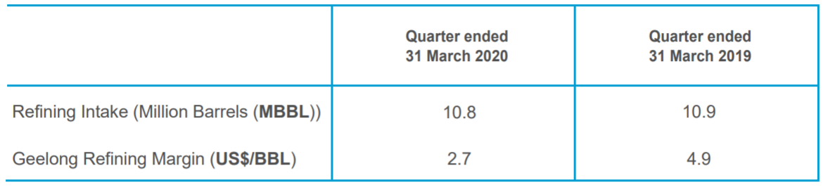 March Quarter Highlights: Viva Energy Group Limited (ASX: VEA) is a leading energy company in Australia which supplies around a quarter of the country’s liquid fuel requirements. On 9 April 2020, the company provided an update, wherein it informed that its Retail segment has performed well during the 2020 March quarter with the Alliance network achieving average sales volumes of 62.4 million litres per week in the period. Further, the company’s commercial sales volumes in the March quarter were in-line with the same period last year. For the quarter, the company reported actual Geelong Refining Margin of US$2.7/Barrel (BBL), with a refining intake of 10.8MBBLs.