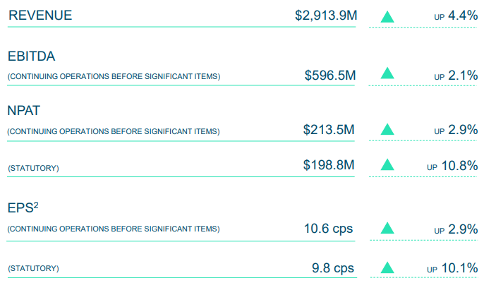 1HFY20 Key Highlights for the Period ended 31st December 2019: The company experienced a solid result in 1HFY20, which was bolstered by diversified businesses of the Group.Its revenue grew by 4.4% on year over year basis and stood at $2,913.9 million. EBITDA for the period came in at $596.5 million, up 2.1% year over year. Net profit for the period came in at $213.5 million, up 2.9% year over year. The company declared a fully franked interim dividend of 11 cents per share for 1HFY20.