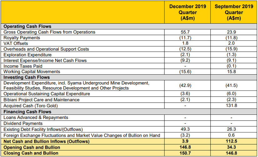Q4FY19 Cash Flow Highlights for the Period ended 31 December 2019: RSG announced its quarterly cash flow highlight, wherein the company reported development expenditure at $42.9 million, followed by working capital movements at -$15.6 million.Overheads and operational Support costs stood at $12.5 million. The company reported inflows from its existing debt facilities at $49.3 million during the third quarter of FY19. The business reported closing cash and bullion at $150.7 million.
