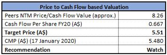 Stock Recommendation: The stock of NUF is quoting at $5.480 with a market capitalization ~$2.31 billion. The stock has generated a mixed return of -7.16% and 38.41% in the last three months and six months, respectively. The stock is quoting at the upper band of its 52-week trading range of $3.605 to $6.940. The business has lowered its H1FY19 guidance due to higher costs, lower demand, difficult climatic conditions and stiff competition within the market. Considering the aforesaid facts, we have valued the stock using one relative valuation method, i.e., price to cash flow based approach. We have taken peers such as Graincorp Ltd (ASX: GNC), ALS Ltd (ASX: ALQ), Rural Funds Group (ASX: RFF) and arrived at a target price of very limited upside (in % terms). Hence, we have a watch rating on the stock at the current market price of $5.480 per share, down 10.016% as on 17 January 2020, on account of earnings downgrade.