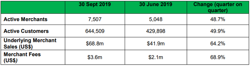 Q3FY19 Operational Highlights for the Period ended 30 September 2019: SZL declared its quarterly results, wherein the company reported active merchants at 7,507, up 48.7% on q-o-q basis. Active Customers came in at 644,509, depicting a growth of 49.9% on q-o-q basis. Underlying Merchant Sales (UMS) came in at US$68.8 million, up 64.2% on q-o-q basis while Underlying Merchant Fees came in at US$3.6 million, up 68.9% from Q2FY19. The Company added 2,459 Active Merchants to the platform during the September Quarter followed by 214,611 number of Active Customers during the third quarter of FY19..png)