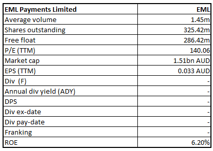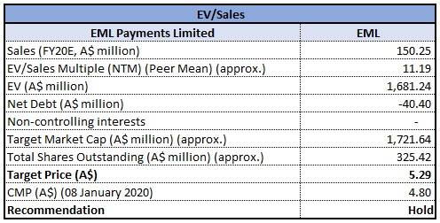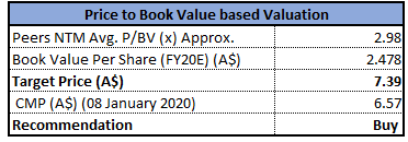Stock Recommendation: As per ASX, the stock gave a return of 8.2% in the one year.Currently, the stock is trading above the average of its 52-week high and low of $7.250 and $5.71, respectively. As on 08 January 2020, the company’s market capitalisation stands at ~$2.32 billion, with 345.39 million outstanding shares.In FY19, EBITDA margin of the company stood at 52.4%, higher than the industry median of 28.4%. Current ratio of the company was 7.04x as compared to the industry median of 2.81x, which implies a better liquidity position of the company.Considering the above scenario, we have valued the stock using price to book value based relative valuation method and for the purpose, have taken the peer group - EML Payments Ltd (ASX: EML), WiseTech Global Ltd (ASX: WTC), Over the Wire Holdings Ltd (ASX: OTW), etc. Therefore, we have arrived at a target price with an upside of lower double-digit (in % terms). Hence, we give a “Buy” recommendation on the stock at the current market price of $6.570 per share, down 2.377% as on 08 January 2020.