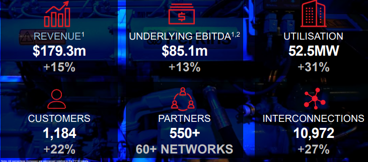 FY19 Highlights for the Period Ended June 30, 2019: The company’s revenue went up by 15% year over year and came in at $179.3 million. Underlying EBITDA increased 13% on a yearly basis and stood at $85.1 million. Underlying capital expenditure stood at $378 million, up from $285 million in FY18. The company’s sale from contracted utilisation reached 52.5MW in FY19, representing an increase of 31% on FY18. Interconnections in FY19 stood at 10,972, up 27% on pcp. The company exited FY19 with cash and cash equivalents of $399 million.