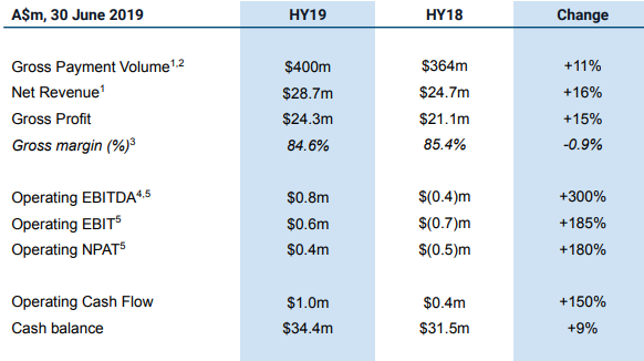 1HFY19 reported a record GPV and net revenue of $400 million and $28.7 million, respectively, representing an increase of 11% and 16% on prior corresponding period.