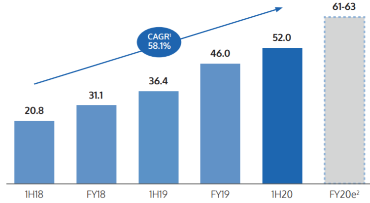 The company has recently released its interim results for the period ending 31 December 2019, wherein it reported an increase of 42.8% in Annualized recurring revenue to $52 million and witnessed a CAGR of 58.1% from 1H18 to 1H20. The company has a large and growing addressable market with increasing customers to 1,478 up from 1,129 in 1H19..png)
