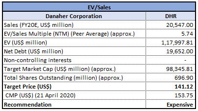 Stock Recommendation: The stock of DHR closed at $153.75 with a market capitalization of ~$107.1 billion and a P/E multiple of 37.96x. The stock has made a 52-week low and high of $119.6 and $169.19 and is currently quoting close to the upper end of the range. Thestock has given positive returns of 24.18% and 21.28% in the last one month and one year, respectively. The company expects to report the first-quarter results on 07 May 2020.Considering the operational excellence, focused execution, and current trading level, we have valued the stock using EV/Sales multiple based illustrative relative valuation method and arrived at a correction of higher single-digit (in % terms). For the purpose, we have considered peers like Thermo Fisher Scientific Inc (NYSE: TMO), Illumina Inc (NASDAQ: ILMN), and Hologic Inc (NASDAQ: HOLX), to name few. Considering the current trading levels, recent price movement, a high P/E multiple, and valuation, we give an “Expensive” rating on the stock at the current market price of $153.75, down 1.33% as on 21 April 2020.
