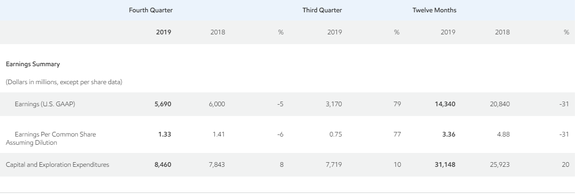 FY19 Business Highlights for the period ended 31 December 2019: In FY19, the company reported total revenues and other income of $264,938 million, down from $290,212 million in FY18. The business reported total earnings from its upstream segment of $14,442 million, up from $14,079 million in FY18. The business reported downstream earnings of $2,323 million, as compared to $6,010 million in FY18, on the back of lower margins comprising narrower North America crude differentials within the U.S segment and lower margins comprising unfavorable mark-to-market derivatives within the non-US segment.