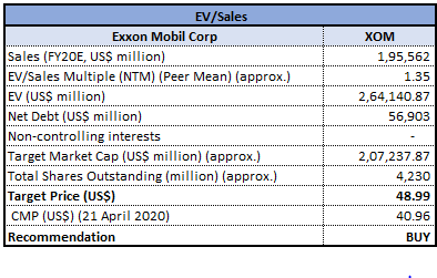 Stock Recommendation: The stock of XOM closed at $40.96 with a market capitalization of ~$173.3 billion. The stock made a 52-week low and high of $30.11 and $83.49 and is currently trading at the lower band of the range. Thestock witnessed a sharp correction of 39.39% and 49.51% in the last three months and one year, respectively.Given the current oil market scenario, the stock has seen a roller coaster ride in the recent times. Considering the aforesaid facts, current trading levels and business prospects, we have valued the stock using EV/Sales based illustrative relative valuation method. For the purpose, we have considered peers like Chevron Corp (NYSE: CVX), ConocoPhillips (NYSE: COP) and Halliburton Co (NYSE: HAL), to name few and arrived at a target price with lower double-digit upside (in % terms). Given the current oil market scenario and covid-19 impact on the businesses, dampened activities, etc., the stock has seen a roller-coaster ride in the recent times. However, we believe that long-term outlook for the company remains intact and with the revival in the economic activities, demand for the products is likely to see an improvement, going forward. Hence, we give a ‘Buy’ recommendation on the stock at the closing price of $40.96, down 0.53% as on 21 April 2020.