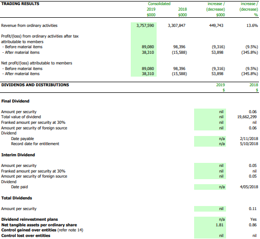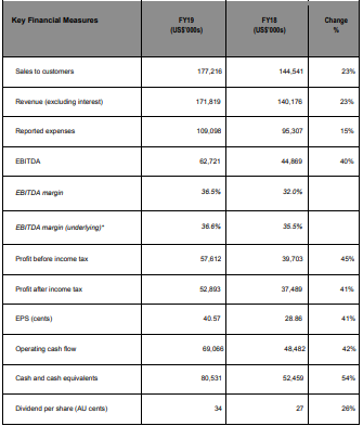 FY19 Key Financial Highlights for the period ended July 31, 2019:Revenue for the period increased by 14% to $3,758 million with growth in all regions except Australia and New Zealand. Underlying EBITDA for the period increased by 9% to $420 million, driven by a full-year contribution from the European portfolio acquisitions and growth in the North America, Seed Technologies and Asia business segments. Underlying net profit after tax decreased by 9% primarily due to the impact of a full year of depreciation and amortisation relating to the acquired European portfolios.