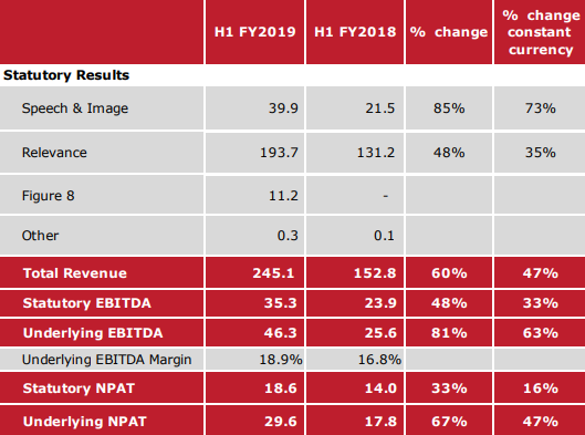 H1FY19 Key Financial Highlights for the period ended June 30, 2019: The company reported strong core performance with Speech and Image revenue increasing at a rate of 85% on pcp. Overall revenue of the business went up by 60% to $245.1 million. Underlying NPAT for the period improved by 67% to $29.6 Mn..png)