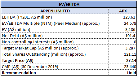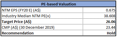 Stock Recommendation:The stock generated a positive YTD return of 85.00%. The company has diversified its revenue and expanded into its existing market with remarkable results from Figure Eight execution. Considering company’s strong customer relationships, contribution from Figure Eight’s acquisition, FY19 first half performance and increase in earnings guidance, we have valued the company using two relative valuation methods, i.e., PE and EV/EBITDA multiples approach and arrived at a target price with lower double-digit upside (in % terms). Hence, we recommend a “Hold” rating on the stock at the current market price of $23.440, down 1.014% on 30 December 2019.
