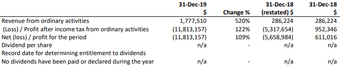 Half Yearly Financial Highlights: During the first half ended 31st December 2019, the company reported revenue from ordinary activities amounting to $1.78 million, up 520% on pcp revenue of $0.29 million. The period was marked by material increases for new prescriptions in Ireland, the UK, Brazil and Australia, which represents the revenue generation potential of the business. .png)