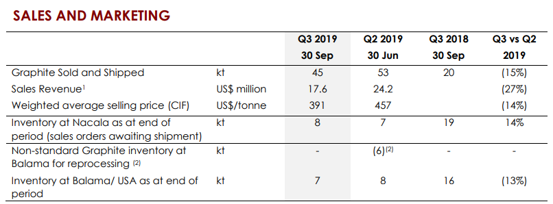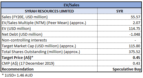 Q3FY19 Operational Highlights for the Period Ended 30 September 2019:SYR announced its quarterly results, wherein the company reported graphite production of 45kt, up from 44kt in Q2FY19. On YTD basis, total production stands at 137kt with ~50% of capacity utilization. During Q3FY19, the company improved recovery at 69% as compared to 66% in Q2FY19, aided by continued elimination of recovery constraints and a proven increase in process control and operational stability. During September 2019, the company reported 71% recovery, aided by increased production ratio of coarse flake graphite to 16% as compared to 12% in Q2FY19. .png)