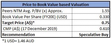Stock Recommendation:The stock of NIC is quoting at $0.610 with a market capitalization of ~$1.07 billion. The stock has delivered a mixed return of -12.33% and 72.97% in the last three months and six months, respectively. The stock is trading at the upper end of its 52-week trading range of $0.220 and $0.750. The business reported improvement in its price realisation during the second half of September quarter. Considering the aforesaid facts, we have valued the stock using one relative valuation method, i.e., price to book value multiple and arrived at a target price of lower double-digit upside (in % terms). Looking at the price movement, current trading levels, increased production and improved realisation, we recommend a ‘Speculative Buy’ on the stock at the current market price of $0.615, down 3.906% as on 17 December 2019.
