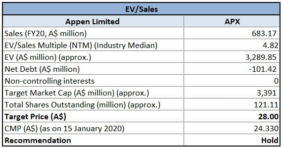 Stock Recommendation: As per ASX, the stock gave a return of 9.11% on YTD basis and a return of 2.80% in the last one month. For 1H19, gross margin of the company improved from the prior period and stood at 40.8%. In the same period, Return on Equity was in-line with the industry median and stood at 6.2%. Considering the returns, improvement in gross margin and increased EBITDA guidance, we have valued the stock using one relative valuation menthod, i.e., EV/Sales multiple approach and arrived at a target upside of lower double-digit (in percentage terms). For the said purposes, we have considered WiseTech Global Ltd (ASX: WTC), Altium Ltd (ASX: ALU), Link Administration Holdings Ltd (ASX: LNK) and Iress Ltd (ASX: IRE) as peers. Hence, we recommend a “Hold” rating on the stock at a current market price of $24.33, up by 0.537% on January 15, 2020.