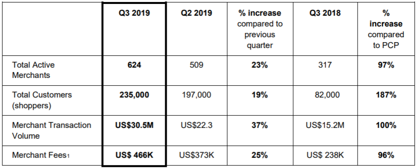 The company has recently released its quarterly update for September quarter, wherein it reported strong growth across all key operational performance metrics. For the quarter ended 30 September 2019, total merchants reached 624, up by 97% on pcp with merchant transaction volume of US$30.5 million, up by 100% from US$15.2 million in Q318. .png)