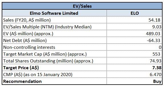 Stock Recommendation: As per ASX, the stock of ELO gave a return of 3.22% in the past one month and a return of 1.74% on YTD basis. Over the period of FY15 to FY19, the company witnessed a CAGR of 41.17% in gross profit. During FY19, gross margin of the company stood at 86.5%, higher than the industry median of 83.7%. This indicates that the company is managing its costs well and is capable to convert its revenue into profit. Considering the returns, CAGR in gross profit and modest outlook, we have valued the stock using a relative valuation method, i.e., EV to Sales Multiple approach and arrived at a target upside of lower double-digit (in percentage terms). For the said purposes, we have considered Xero Ltd (ASX: XF1), Integrated Research Ltd (ASX: IRI), Livetiles Ltd (ASX: LVT), Volpara Health Technologies Ltd (ASX: VHT) as peers. Hence, we recommend a “Buy” rating on the stock at the current market price of $6.47, up by 0.779% on January 15, 2020.