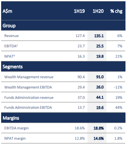 1HFY20 Results:The company recently released its financial results for the six months ended 31st December 2019. During the half, revenue came in at $135.1 million, up 6% on prior corresponding period revenue of $127.4 million. Excluding the contribution from acquisitions, revenue reported a rise of 3% on pcp. NPAT, including acquisitions, went up by 21% to $19.8 million. The company declared an interim dividend of 5.5 cents per share, representing a payout of 68% of NPAT. The Wealth management business saw revenues increase by 1%, with the recently acquired businesses, Midwinter and FinoComp delivering results as per expectations. Revenue of the Funds Administration segment grew by 19%, drawing benefits out of higher licence fees due to expansion on the client front..png)