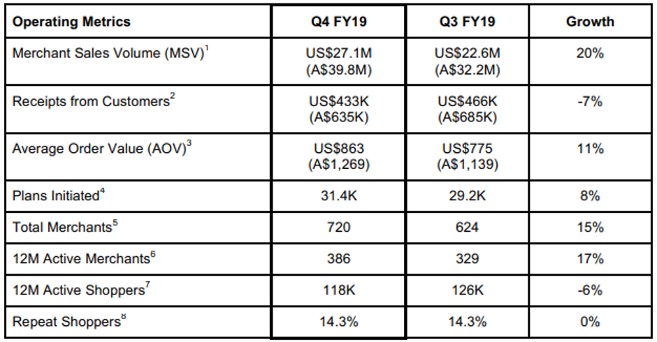 Q4FY19 Performance: During the quarter ended 31st December 2019, the company saw merchant sales volume (MSV) grow to US$27.1 million, representing an increase of 20% on the previous quarter. Revenue for the period came in at US$433,000, down 7% on the previous quarter. However, the company also notified about US$71,000 of additional revenue from funded plans that will be recognised in the coming quarter. During the quarter, the company signed in new merchants and partners and remained well funded for further capitalising on growth opportunities, with a cash balance of US$16.3 million at the end of the period..png)