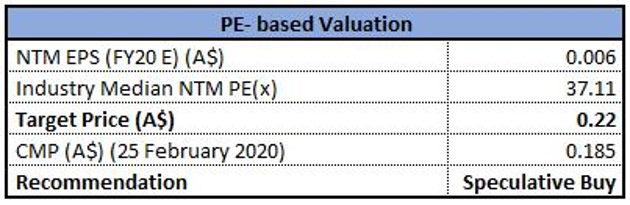 Stock Recommendation:The stock of the company gave negative returns of 16.67% over a period of 1 month.In 1HFY20, the company reported adjusted EBITDA growth of 41% in UK Managed Services and is focused on gaining further market share through continued investment in sales capabilities, new sites, management restructuring, etc. On the technology front, the company sees significant market opportunities and has come up with initiatives to drive the demand for SPZ technology. We have valued the stock using Price to Earnings based relative valuation method and arrived at a target price of lower double-digit upside (in % terms). Hence, we recommend a “Speculative Buy” rating on the stock at the current market price of $0.185, down 7.5% as on 25th February 2020.
