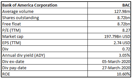 Stock Recommendation:The stock of BAC is closed at $22.67 with a market capitalization of ~$197.79. billion. The stock made a 52-week low and high of $21.51 and $35.72 and is currently trading at the lower band of the range. The bank has a healthy financial ratio along with decent Asset Quality and is expected to retain its leading position in coming years. Considering the aforesaid facts, current trading levels and business prospects, we have valued the stock using price to book based relative valuation method. For the purpose, we have considered peers like HSBC Holdings PLC (NYSE: HSBA), U.S. Bancorp (NYSE: USP), Morgan Stanley (NYSE: MS), etc., and arrived at a target price with a lower double-digit upside (in % terms). Hence, we give a ‘Buy’ recommendation on the stock at the closing price of $22.67, down 3.98% as on 11th March 2020.