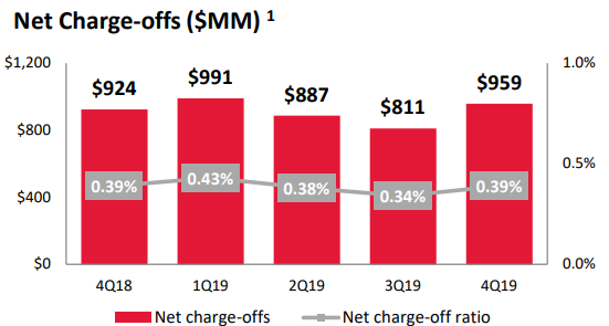 Q4FY19 Operational Highlights:BAC announced its quarterly results, wherein the company reported total loans and leases of $974 billion, up 4% on y-o-y basis aided by 7% growth from the consumer banking and GWIM segment. CET1 ratio stood at 11.5%, as compared to 11.7% in Q3FY19. The business reported Supplementary leverage ratio (SLR) of 6.4%, that declined from 6.6% in Q3FY19. Net interest income came in at $12.3 Billion, with no change from previous quarter. The company reported lower non-interest expense of $13.2 Billion, as compared to $15.2 Billion in Q3FY18 driven by absence of impairment charge of $2.1B for notice of termination of the merchant services joint venture at the conclusion of its current term. As far as the asset quality is concerned, net charge-offs stood at 0.39%, up from 0.34% in previous quarter.
