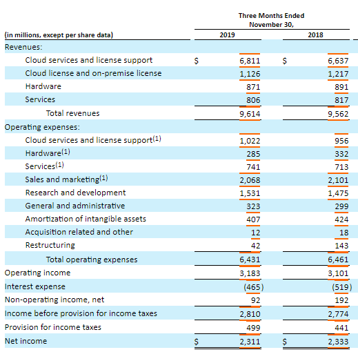 Q2FY20 Operational Highlights for the period ended 30 November 2019:ORCL came up with its quarterly results, wherein the company reported revenue amounting to $9,614, up 1% from FY18. The business reported 3% y-o-y growth in cloud services and license support segment revenue to $6,811 million. Operating income stood higher at $3,183 million, as compared to $3,101 million in Q2FY19, representing 33% of the total revenue. Net income stood at $2,311 million, down 1% on previous corresponding period on account of lower non-operating income. The business reported a capital expenditure of $1,591 million in Q2FY20..png)