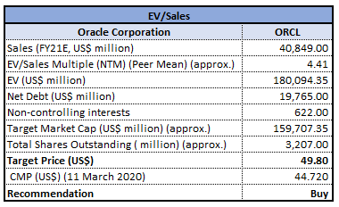 Stock Recommendation:The stock of ORCL closed at $44.72 with a market capitalization of ~$143.45 billion. The stock made a 52-week low and high of $44.26 and $60.50 and is currently trading at the lower band of the range. Oracle is the only one of the big four cloud companies that offers both Enterprise Application Suites and Secure Infrastructure technologies in a single unified cloud. Oracle’s unique spot in both applications and infrastructure overlays the way for enormous innovation, which is expected to deliver improved business performance. Considering the aforesaid facts, current trading levels and business prospects, we have valued the stock using EV/Sales based relative valuation method. For the purpose, we have considered peers like Salesforce.Com Inc (NYSE: CRM), Microsoft Corp (NYSE: MSFT), Amazon.com Inc (NYSE: AMZN), etc., and arrived at a target price with a lower double-digit upside (in % terms). Hence, we give a ‘Buy’ recommendation on the stock at the closing price of $44.72, down 7.95% as on 11th March 2020.
