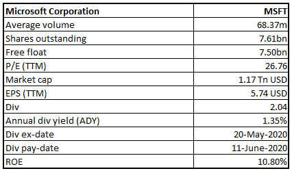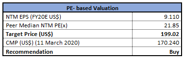 Stock Recommendation: The stock of MSFT closed at $153.63 with a market capitalization of ~$1.17 trillion. The stock made a 52-week low and high of $110.98 and $190.70 and is currently trading above the average of the range. The business provides new aged technology products like intelligent cloud services, personal computing and other applications, which are widely used by the individuals and corporates. Considering the aforesaid facts, current trading levels and business prospects, we have valued the stock using price to earnings based relative valuation method. For the purpose, we have considered peers like Salesforce.Com Inc (NYSE: CRM), Adobe Inc (NYSE: ADBE), Facebook Inc (NYSE: FB), etc., and arrived at a target price with a lower double-digit upside (in % terms). Hence, we give a ‘Buy’ recommendation on the stock at the closing price of $153.63, down 4.53% as on 11th March 2020.