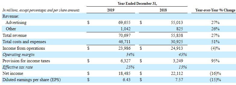 FY19 Operational Highlights for the Period ended 31 December 2019: FB declared its full year results, wherein the company reported its revenue of $69,655, depicting a growth of 27% on y-o-y basis. Daily active users (DAUs) for the month of December 2020 stood at 1.66 billion, depicting a growth of 9% on y-o-y basis. Monthly active users (MAUs) grew 8% on y-o-y basis to 2.50 billion as of December 2020.Income from operations stood at $23,986 million, down 4% on pcp basis on account of 51% rise in total costs and expenses to $46,711 million. For FY19, the company reported itscapital expenditures amounting to $15.65 billion.