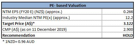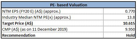 Stock Recommendation:In financial year 2019, the company has implemented a new strategy concentrating on targeting profitable bookings growth with increased margins and lower acquisition costs. Earnings per share of the company stood at 63.3 cps (before AA), reflecting a rise of 31% as compared to the previous year. The Board of the company has declared full-year dividend amounting to 22 cps, with a rise of 10% against the previous year. We have valued the stock using relative valuation method (P/E valuation multiple) and have arrived at the target price which is offering an upside of lower double digit (in percentage terms).Therefore, considering the company’s decent performance in FY19, favorable business prospects and increased final dividend, we give a “Buy” recommendation on the stock at the current market price of A$12.780 per share, up 9.605% on 11th December 2019. It looks like the upside is primarily due to response towards a media speculation.