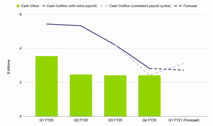 Cash Position: As a result of COVID-19 outbreak, the company witnessed accelerated adoption and took advantage of this opportunity to lessen cash expenses. Since December 2019, the company has scaled back event costs, travel, development costs, office leases and has reduced headcount from 98 to 61 people. Cash outflows in the June quarter stood at $2.8 million, down 47% from Q2FY20. The company has decided to change the payroll calendar for FY21 from the current 13 periods a year to the more traditional 12 months per year. As a result, in Q1FY21, the company expects cash outflows of $2.7 million, representing a decline of 50% on the prior corresponding quarter.