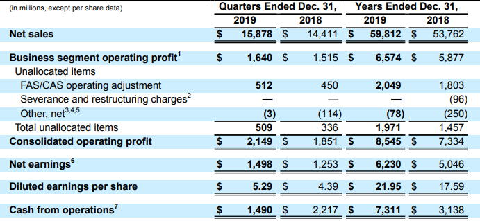 4QFY19 Financial Highlights for the Period ended 31 December 2019: During, the quarter, the company reported earnings of $5.29 per share, up from $4.39 reported in the year-ago quarter.Net sales in 4QFY19, stood at $15.88 billion, which went up from $14.41 billion reported in the year-ago period. Notably, during the quarter all segments reported year-over-year sales growth. LMT reported an operating profit of $1.64 billion, up from $1.51 billion reported in the year-ago period.