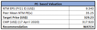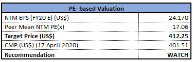 Stock Recommendation: The stock of COST closed at $317.92 with a market capitalization of ~$140.4 billion. The stock made a 52-week low and high of $233.05 and $325.26 and is currently quoting at the upper band of its trading range. Thestock witnessed positive returns of 3.56% and 29.47% in the last one month and one year, respectively. Considering the operational excellence, focused execution, outlook and current trading level, we have valued the stock using P/E multiple based illustrative relative valuation method and arrived at a target price of limited upside (in % terms). For the purpose, we have considered peers like Walmart Inc (NYSE: WMT), Target Corp (NYSE: TGT), and Dollar General Corp (NYSE: DG). Hence, we have a watch stance on the stock at the current market price of $317.92, down 1.13% as on 17 April 2020.