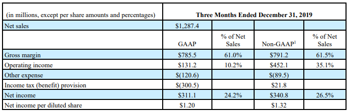 3QFY20 Financial Highlights for the Period ended 31 December 2019: During the quarter, the company reported non-GAAP earnings of $1.32 per share. Net sales for the quarter stood at $1.287 billion, down 6.4% year over year. Management noted slow demand across communication and appliance end-markets. During the quarter, non-GAAP gross margin came in at 61.5%, which was above the high end of its most recent guidance range. Non-GAAP operating margin came in at 35.1%.