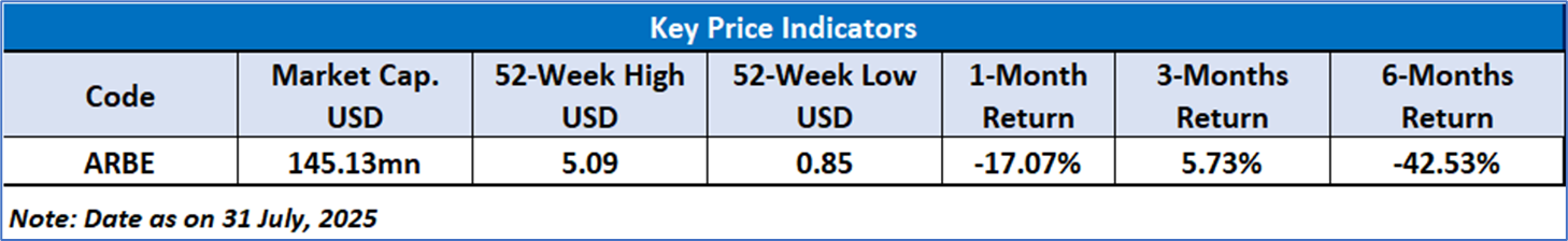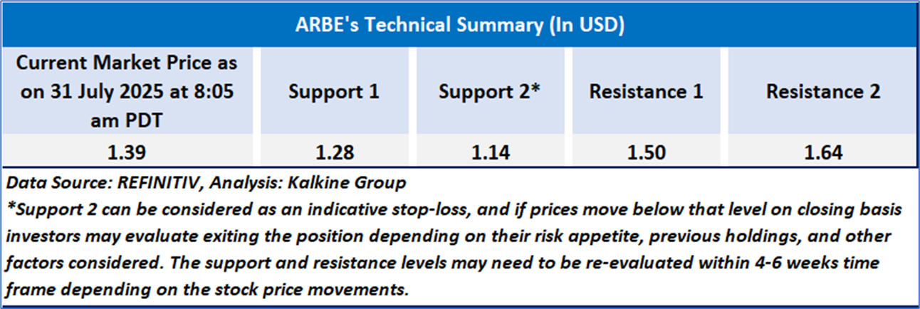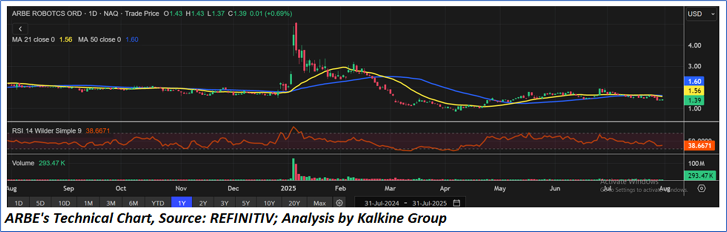 Arbe Robotics (ARBE) is currently in a consolidation phase, trading between USD 1.30 and USD 1.60 after a sharp spike and decline earlier in 2025. The stock remains below its 21-day and 50-day moving averages, indicating a bearish bias, while the RSI near 38 suggests weak momentum and nearing oversold conditions. Volume remains low, reflecting limited investor interest.