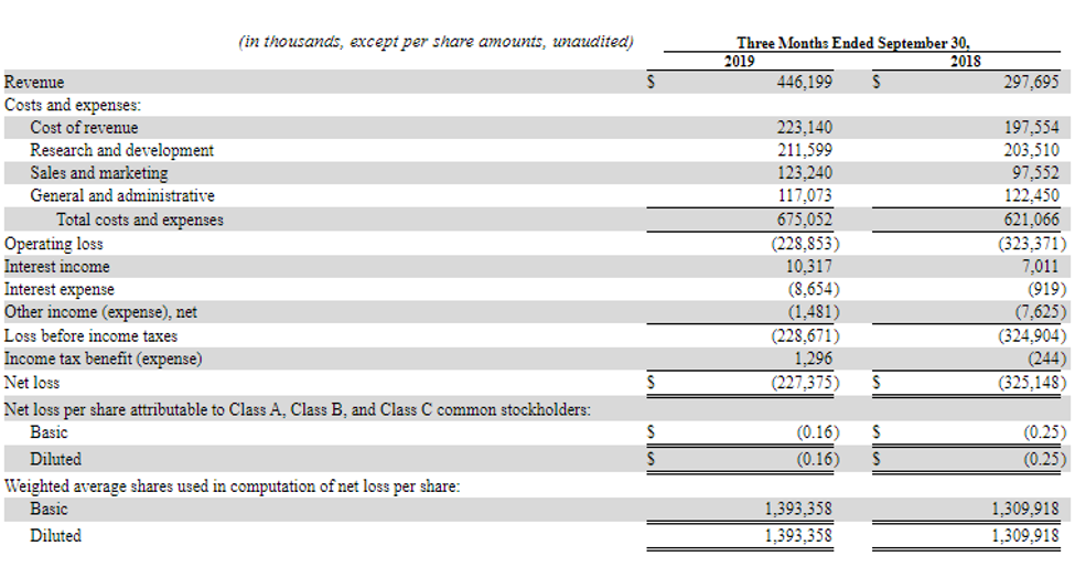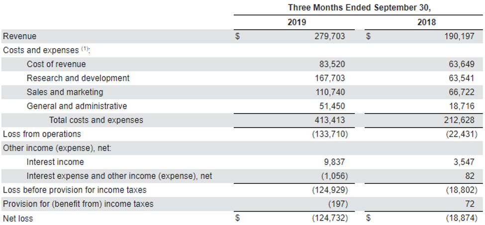 Q3FY19 Financial Highlights for the Period ended 30 September 2019:PINS announced its quarterly results, wherein the company reported revenue at $279.703 million as compared to $190.197 million in previous corresponding quarter, aided by 28% y-o-y growth in monthly active users (MAU). The company reported a loss from operations at $133.710 million as compared to a loss of $22.431 million in Q3FY18. The company reported cost of revenue at $83.520 million as compared to $63,649 million in the previous corresponding quarter. Sales and marketing expenses and general and administrative expenses stood at $110.740 million and $51.450 million, respectively, during Q3FY19. Net loss during the quarter, came in at $124.732 million as compared to $18.874 million in the previous corresponding period. The business exited the quarter with cash and cash equivalents of $1033.871 million while total assets stood at $2,280.472 million. The company reported net cash used in operating activities at $8.901 million, net cash used in investing activities at $202.779 million while net cash provided by financing activities at $1,137.674 million.