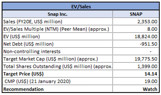Stock Recommendation: The stock of SNAP closed at $19.00 with a market capitalization of $26.599 Bn as om 21 January 2020. The stock is quoting at the upper band of its 52-weeks trading range of $5.74 to $19.29. The company reported improved in operating cash flow and free cash flow in Q3FY19. The company delivered strong results in Q3FY19. Investments made by the company are continuously driving the growth of the community and the business.Considering the aforesaid facts, current trading levels and increase in expenses, we have valued the stock using one relative valuation method, i.e., Enterprise value (EV) to Sales. For the purpose, we have considered peers like Twitter Inc. (NYSE: TWTR), Pinterest Inc. (NYSE: PINS), Facebook Inc (NASDAQ: FB), etc. Therefore, we arrived at a conclusion that the stock might see a correction, moving forward. Hence, we have a watch stance on the stock at the closing price of $19.00, down 0.58% as on 21 January 2020.