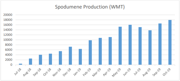 Record Concentrate Production in October: During FY 2019, the company continued to make operational improvements to increase reliability, lift recovery rates, drive up production and reduce unit costs. AJM also achieved consistent sales of high-quality lithium concentrate and has shipped a record cargo of approximately 17,500 wet metric tonnes (wmt) of spodumene concentrate to customers in China.