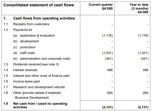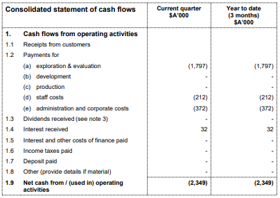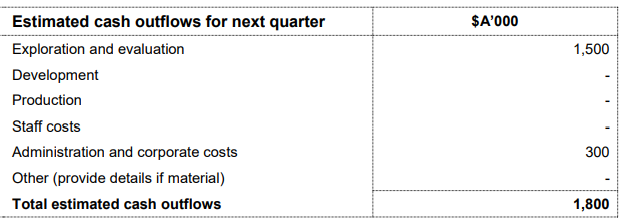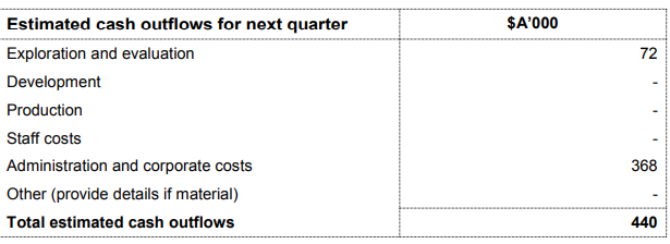 Q2FY20 Cash Flow Guidance:As per the guidance for Q2FY20, the company estimates cash outflows of $0.440 million, including $0.072 million of exploration and evaluation expense and administration and corporate costs of $0.368 million.