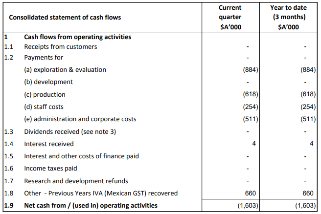 Amount Received form Mexican Tax Office: Azure Minerals Limited (ASX: AZS) is involved in the exploration of base as well as precious metals. The market capitalisation of the Company stood at A$21.9 Mn as on 30th December 2019. Recently, three Directors of the company, namely, Peter Ingram, Anthony Rovira, and Wolf Martinick, acquired 500,000, 1,000,000 and 500,000 options, respectively. Also, AZS received an amount of Mx$6,188,000 from the Mexican tax office, which is the result of the successful resolution of the legal action of the company for the recovery of IVA. The following picture provides an idea of net cash used in operating activities during the quarter ended 30th September 2019:.png)
