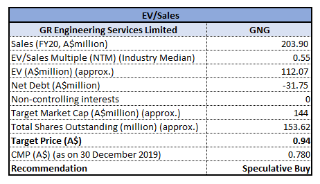 Stock Recommendation: The company experienced positive contributions from Upstream Production Solutions and maintenance service delivery, and the FY19 TRIFR (Total Recordable Injury frequency rate) of the company stood at 4.99 in FY19. The company possesses a strong balance sheet with cash of $31.4 million and interest-bearing debt amounting to $0.5 million. We have valued the stock using EV to sales multiple based relative valuation method and arrived at a target price of double-digit upside (in percentage terms). Therefore, considering the Company’s significant bonding headroom in the form of $130 million total project bonding facilities, Bank guarantee facility amounting to $70 million and Insurance bond facility of $60 million and a decent balance sheet, we give a “Speculative Buy” recommendation on the stock at the current market price of A$0.780 per share on 30th December 2019.