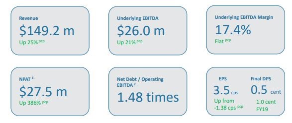 Financial Results for the Year Ended 30 June 2019: In FY2019, the company reported revenue amounting to $149.2 million, up 25% on the prior corresponding year. Underlying EBITDA for the period came in at $26 million, up 21% on the previous year. Underlying EBITDA margin for the year remained flat in comparison to the previous year at 17.4%. Net profit after tax came in at $27.5 million in FY2019, up 386% year over year. The final dividend payment stood at 0.5 cents per share, taking FY19 total dividend to 1 cent per share.
