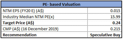 Stock Recommendation: As per ASX, the company’s stock is trading slightly above the average of its 52-week trading range of $0.145 - $0.285. As on 16 December 2019, the company’s market capitalisation stands at ~$165.21 million, with 768.4 million outstanding shares. FY19 was characterised by several acquisitions along with expansion of the clinic network and new market entry. Going forward, the company is aiming to implement scalable systems and business processes to drive growth in FY20. Considering the aforesaid facts, we have valued the stock using price to earnings based relative valuation method and arrived at a target price of lower double-digit upside (in % terms). Hence, we recommend a “Speculative Buy” rating on the stock at the current market price of $0.215 as on 16 December 2019.